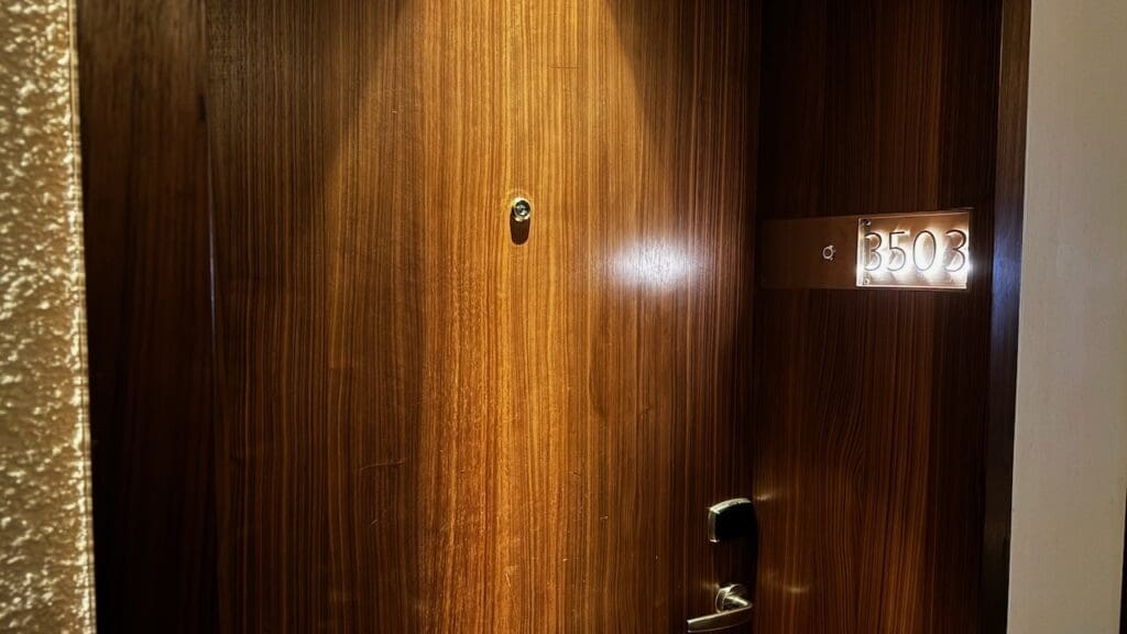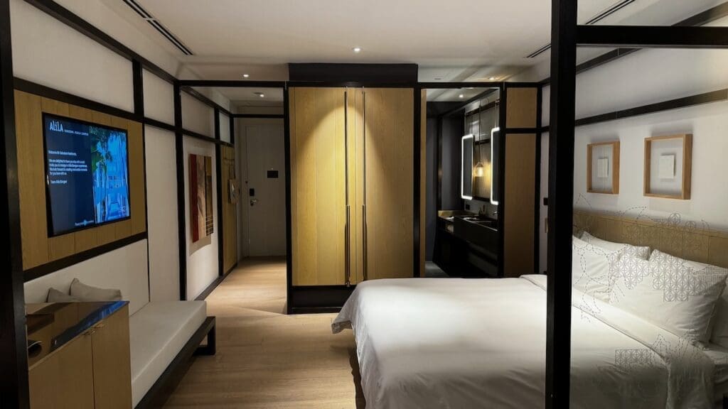 I was assigned room 3503. Stepping into the room, you’ll first step into an entryway with a door to the bathroom to the left and the bedroom ahead. There’s a TV on the wall facing the bed with a bench.