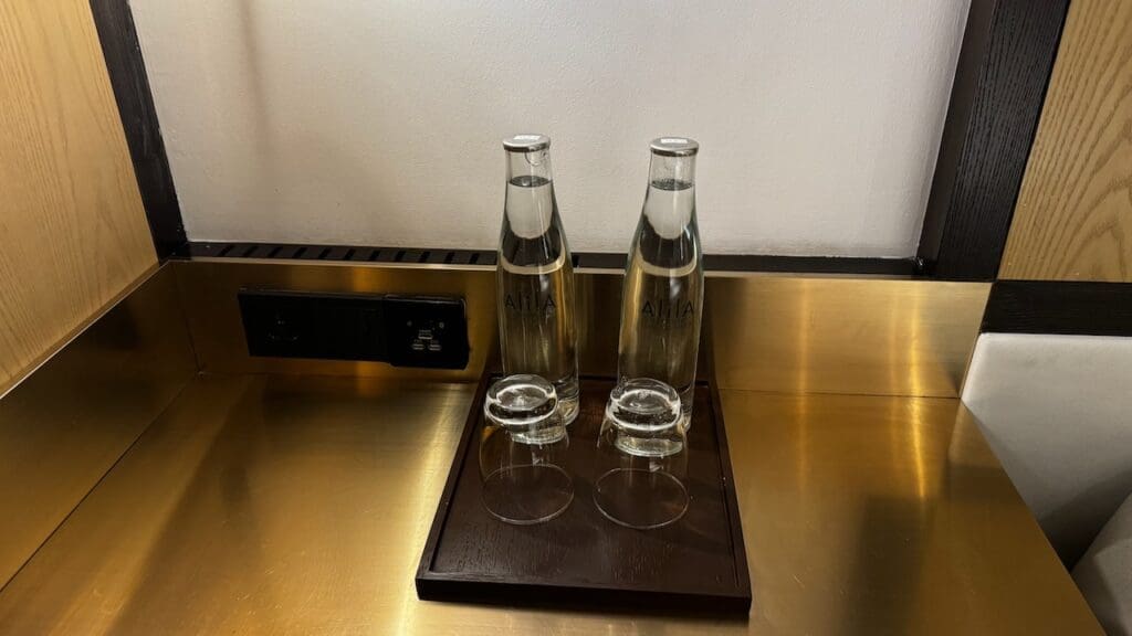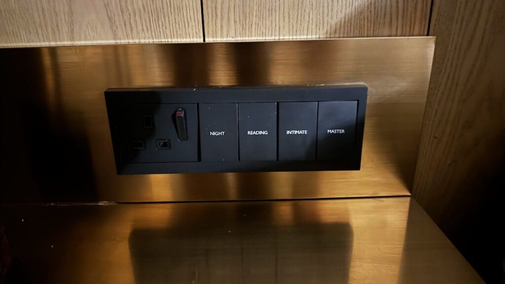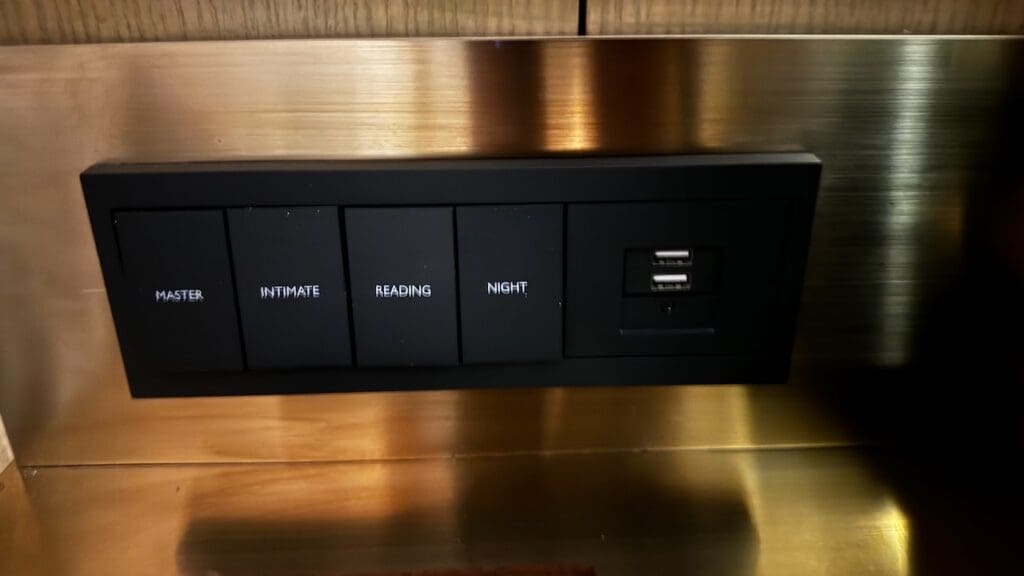 One either side of the bed is a reading lamp and controls for the room, including an “intimate” mode”. On the left side, there was a British-style outlet (not universal), while the right had USB-A outlets.