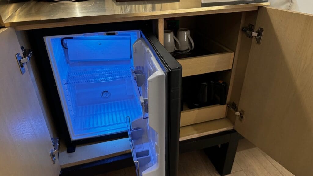 There is an unstocked minibar in the bedroom area and a kettle for tea and instant coffee. There were also a couple bottles of complimentary water.