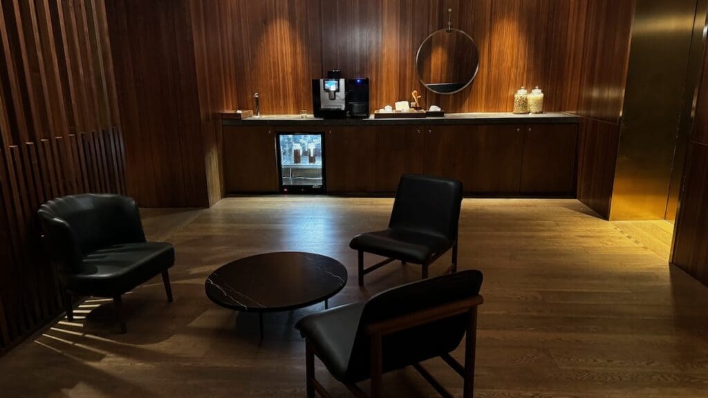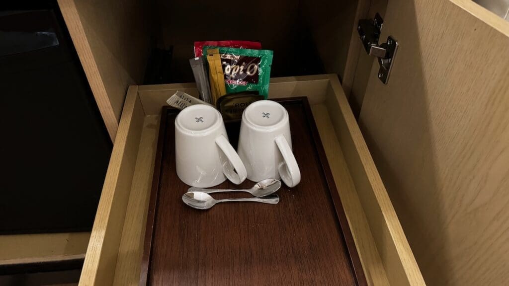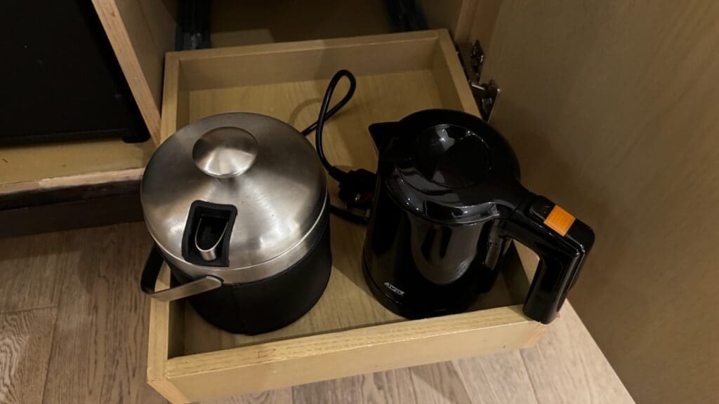 While there’s no coffee machine in the rooms, there are self-service coffee stations along with drinking water and snacks on each floor of the hotel along with a mini communallounge area.