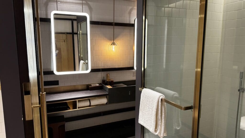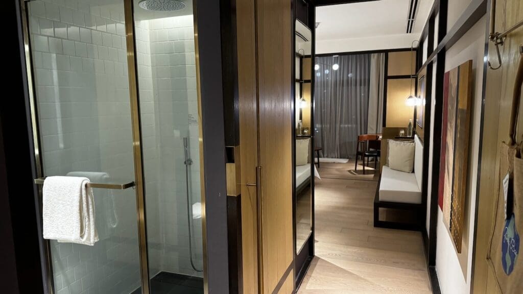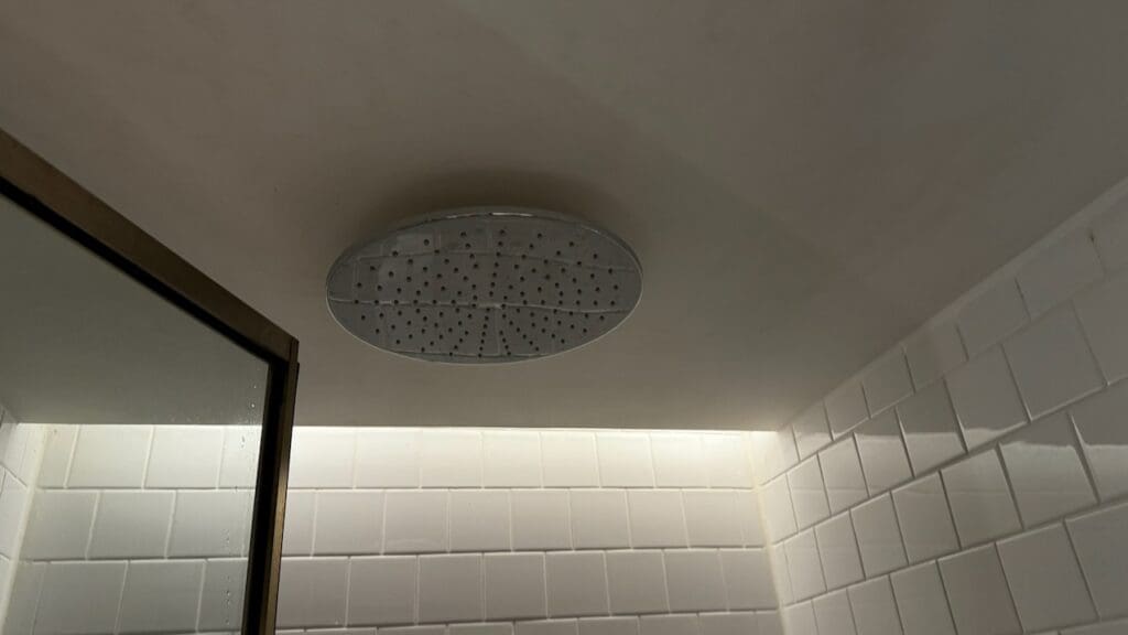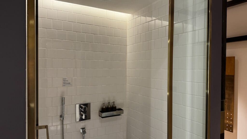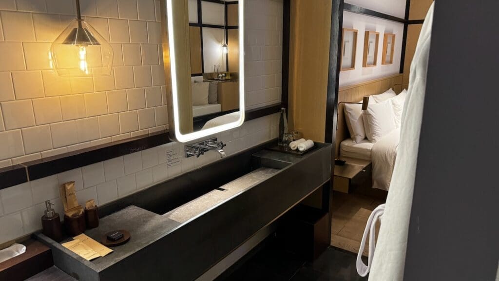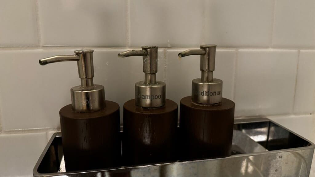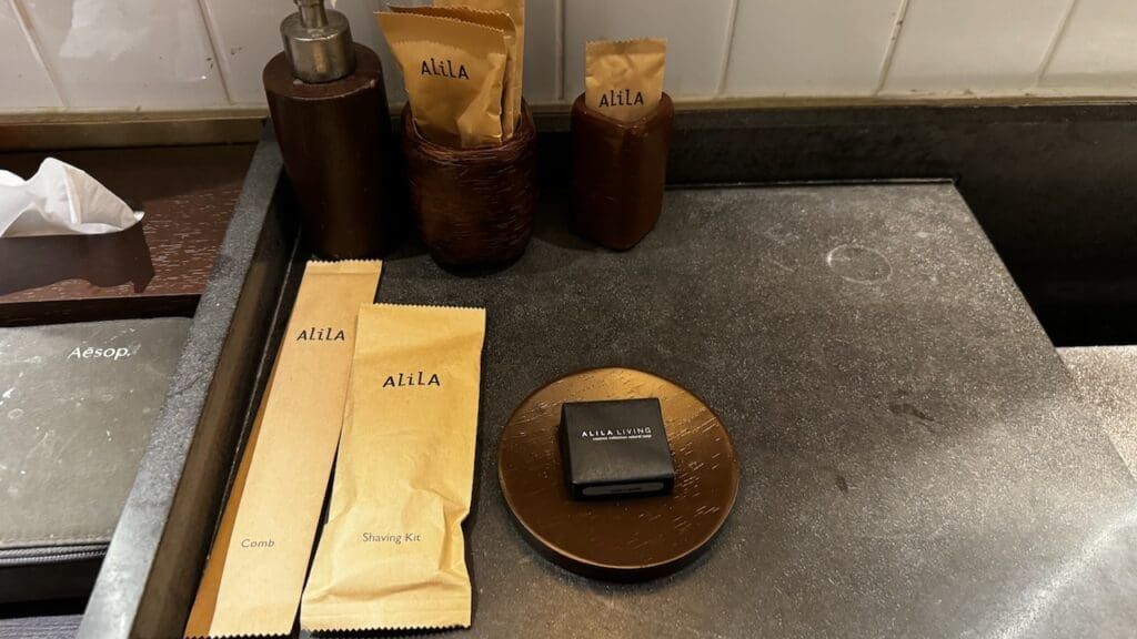 There is a waterfall shower. Toiletries are in bulk containers from Alila’s in-house Alila Living collection which is an exclusive “signature feature” at its hotels and resorts. There’s not a ton online about the brand but several social posts (from 2016) and a webpage from 2021 notes that the products are made in Bali from organic ingredients and used across the brand’s portfolio.