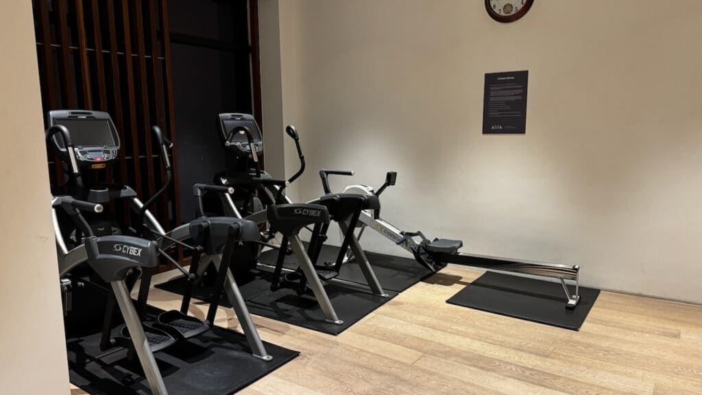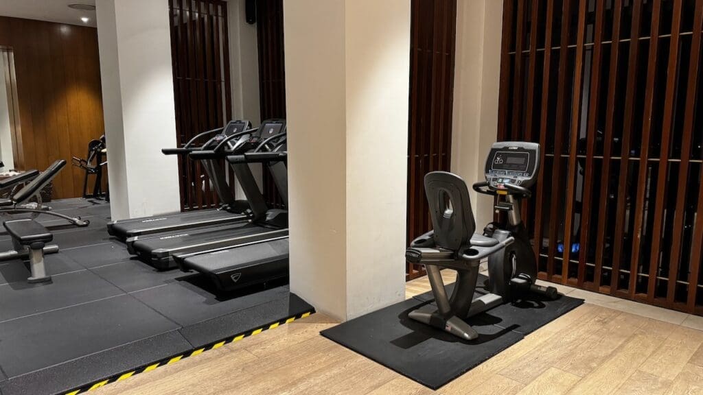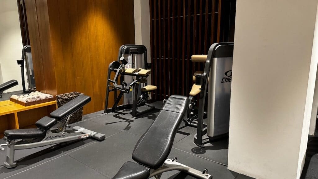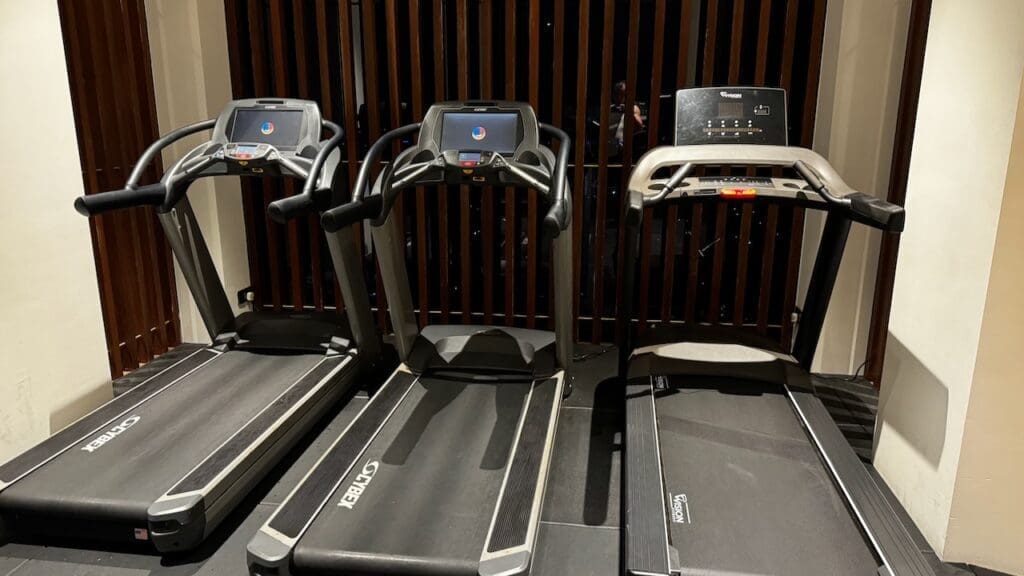 There’s a small fitness room with a couple weight training machines, cardio equipment including three treadmills and a rower, three benches, and free weights going up to 25 kgs (approximately 55 lbs).
