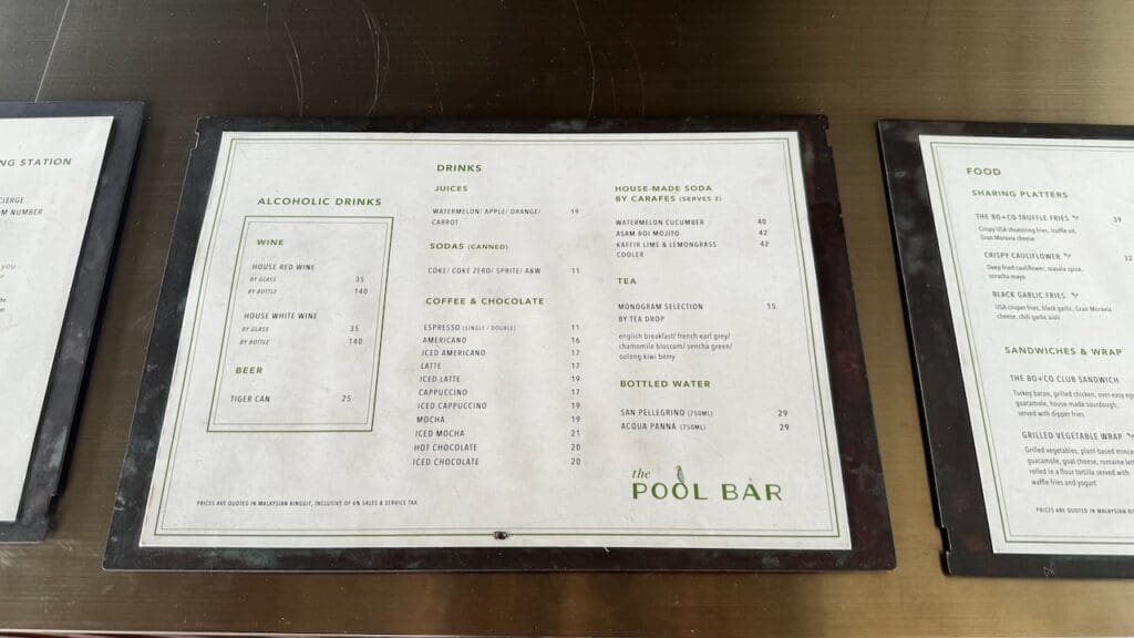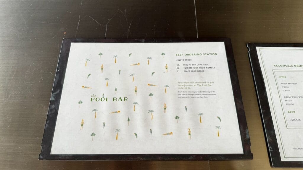 There’s a pool bar with a self-ordering station next to the pool. There’s a menu consisting of various drinks and casual food choices and a telephone to place an order. It’s an interesting concept but I didn’t see anyone utilizing this feature.