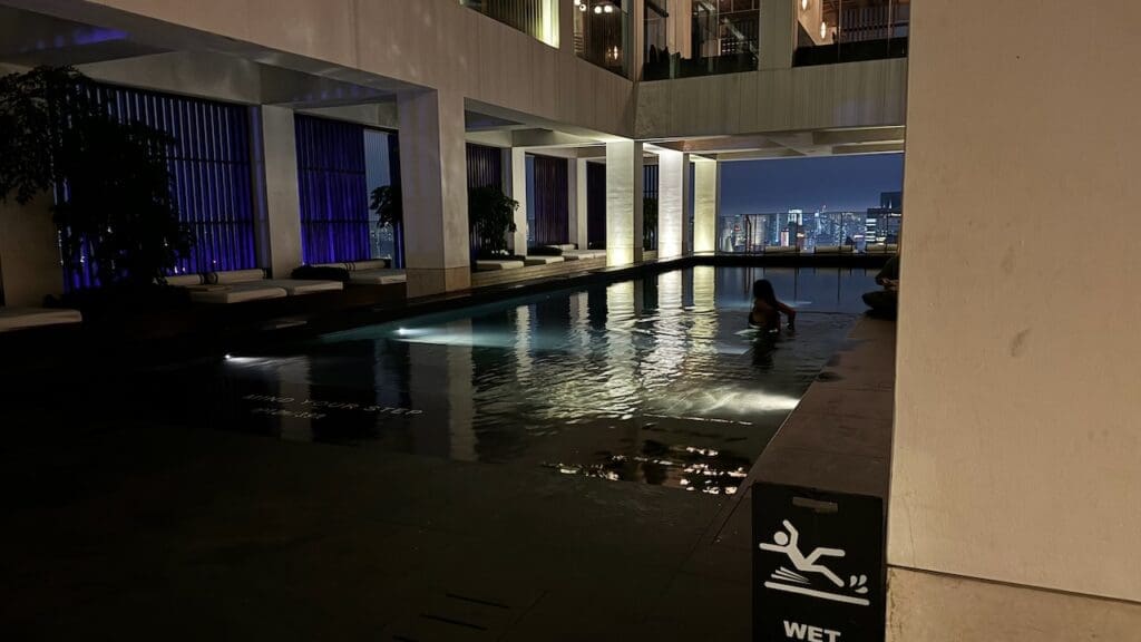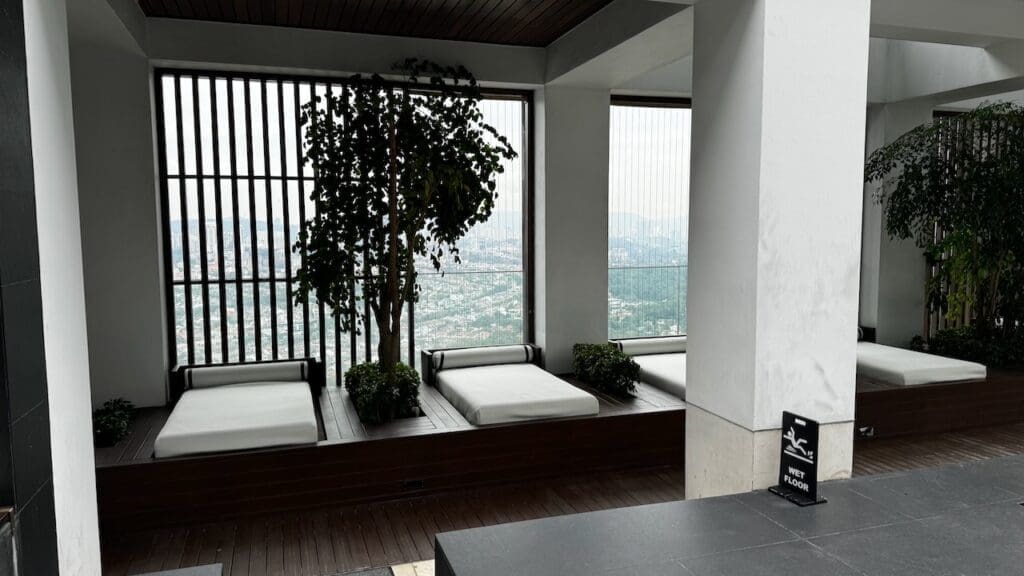 To be completely frank, I love this pool and it wouldn’t be out of place in a much more expensive property. it boasts an excellent vantage point over downtown Kuala Lumpur with views of Merdeka 118 and Kuala Lumpur Tower. There are loungers along the side and a pool bar at the end. On the opposite end, there’s a terraced green staircase leading down from the lobby on the 41st floor to the pool.