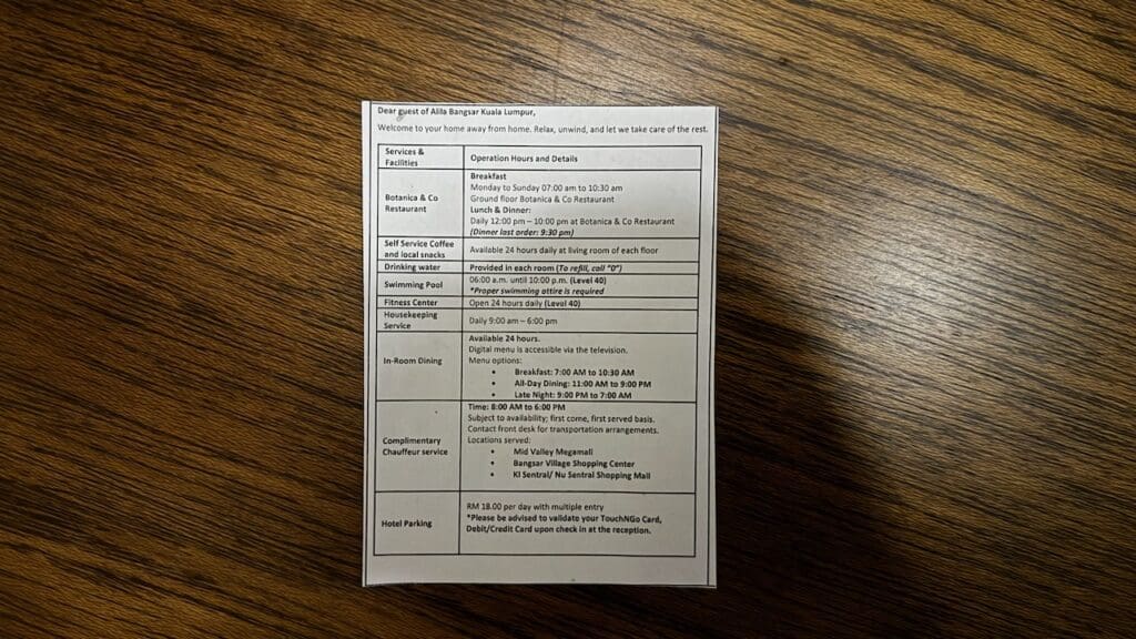 Another addition since the last time I stayed at the Alila Bangsar is a complimentary chauffeur service from 8 am to 6 pm. The chauffeur service functions to KL Sentral/Nu Sentral Mall, Bangsar Village Shopping Center, and Mid Valley Megamall. Bookings are necessary at least an hour in advance and are on a first-come, first-served basis.