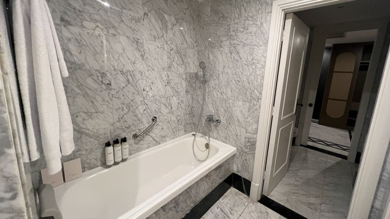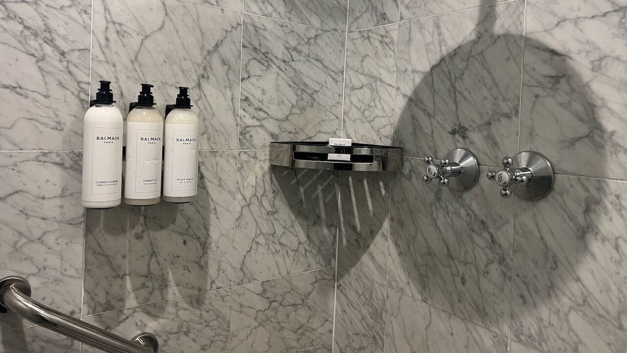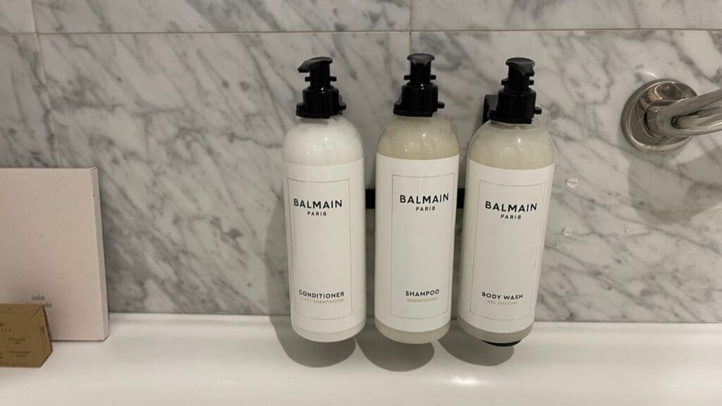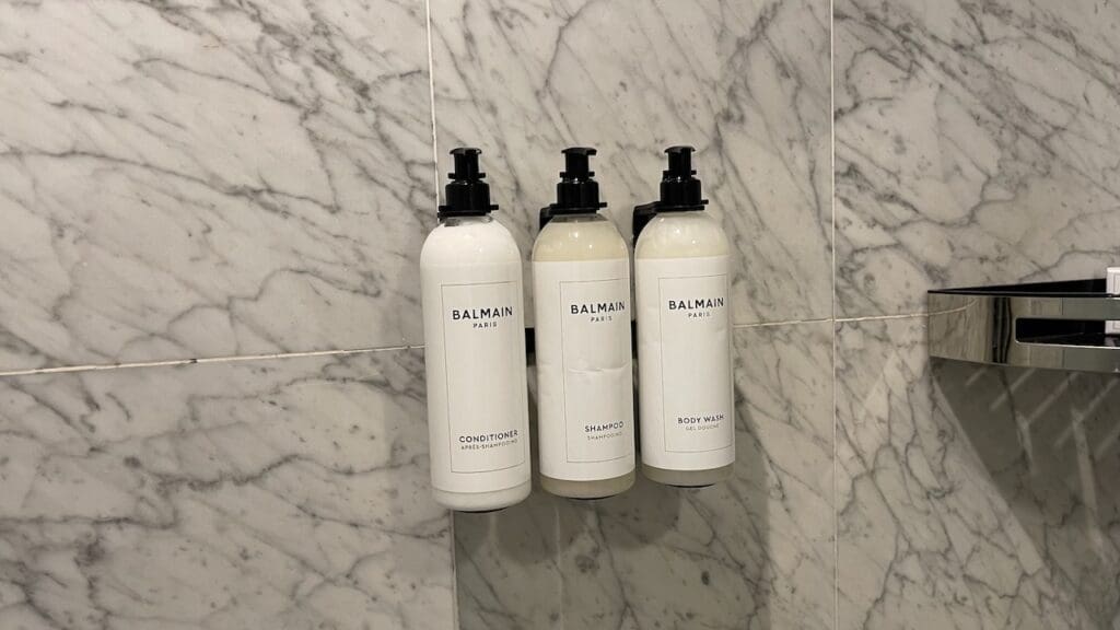 There were wall-mounted toiletries from Balmain in reusable containers in both the bathtub and the shower.