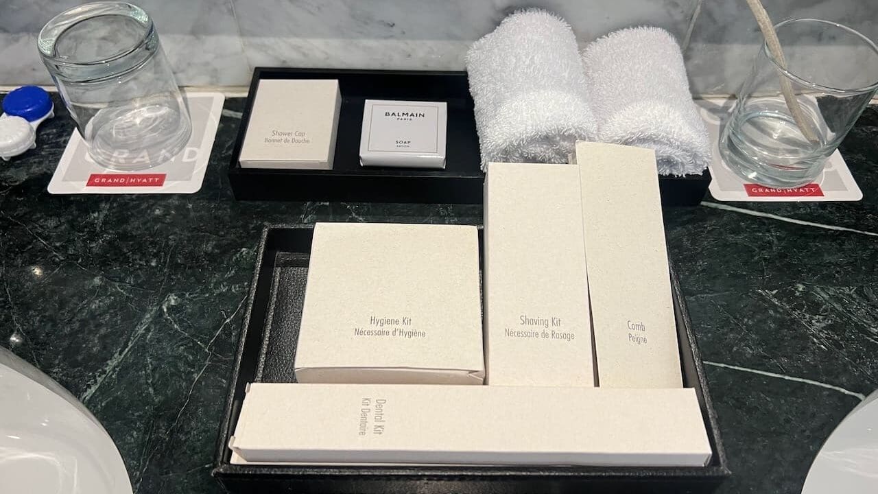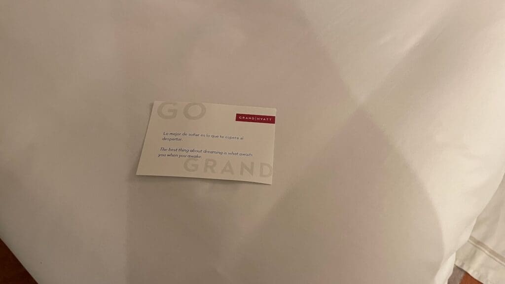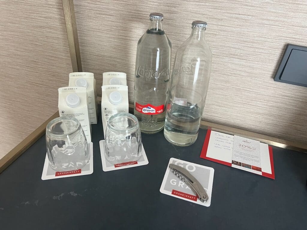 The Grand Hyatt La Manga delivered. Waiting on the coffee table was a welcome amenity consisting of a bottle cava and some macrons. This was accompanied by a high-end face cleanser from Natura Bissé, a Catalan brand based not far away in Barcelona. There was also a welcome note along with the GM’s business card.