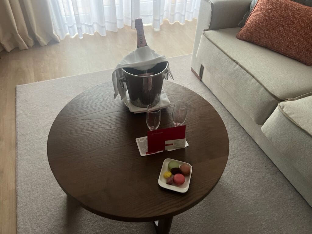 To me, one of the things that can really improve a stay is a getting a nice welcome amenity from the hotel. While simply the gesture of a welcome gift is enough to make me happy, my favorite welcome amenity is a bottle of Champagne or at least sparkling wine (although I did love the welcome gift of boxed cocktails at Hyatt Centric Milano Centrale). In any case, as long as it’s alcoholic and not beer, I’m a particularly happy camper.