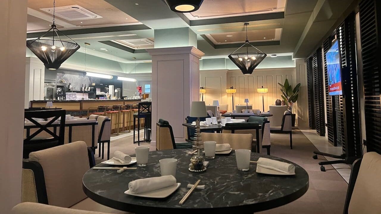 The space is also used for the Asia Restaurant. They start setting up while the space is still being used for the Grand Club, including with a vertical rather than horizontal placement of chopsticks.