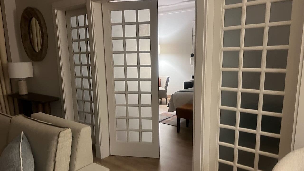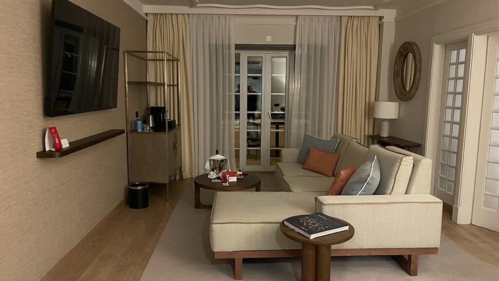 After stepping through the entryroom, the first room you’ll see is a spacious living room. It is equipped with a comfortable couch facing a TV, a coffee machine/minibar setup in the corner, and a pair of French doors into the bedroom to the right and doors to the terrace facing the golf course ahead.