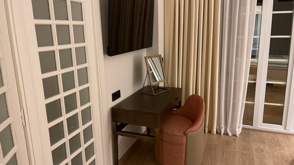 Going through the French doors, you walk into the bedroom which is equipped with a comfortable king size bed, makeup desk, and sitting area. The terrace is also directly accessible from the bedroom.